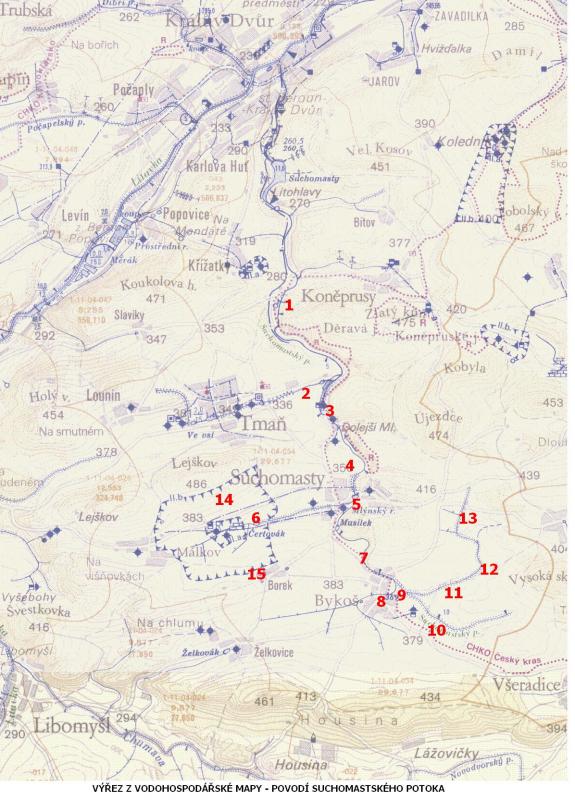 rozsáhlá podélná revitalizace Suchomastského potoka, v povodí vybudováno několik polosuchých poldrů, nádrží, tůní a mikrotůní, odstranění migračních překážek v toku - nahrazení betonových stupňů kamennými skluzy, protierozní ochrana zemědělských pozemků - zřízení zasakovacích travních pásů s výsadbou ovocných dřevin na nejvíce svažitých pozemcích